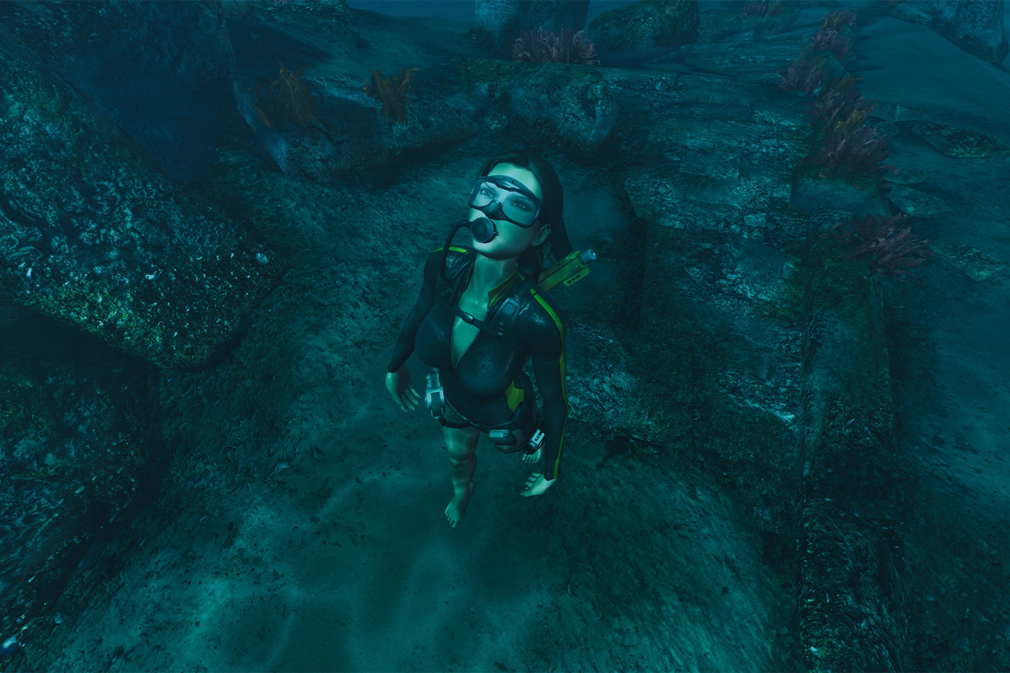 Perfect for exploring the beautiful but hazardous depths of the Mediterranean Sea, Lara equips a scuba set whenever she is underwater. This provides her with an unlimited air supply, allowing her to freely explore any underwater location. Lara removes the scuba facemask once she's on dry land.